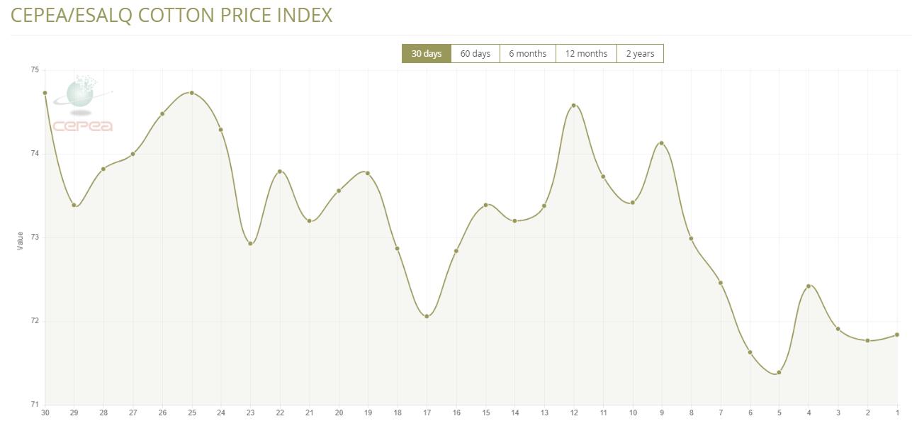 8月27日(周三),巴西CEPEA/ESALQ棉花價格指數(shù)報71.84美分/磅,較前一交易日上漲0.10%,較上月同期下跌2.34%。
