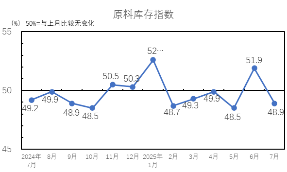 2025年7月,原料庫存指數(shù)為48.9%,低于臨界點(diǎn),較6月下降3.0個百分點(diǎn),行業(yè)主要原材料庫存量下降。7月,紡織廠棉花采購和非棉纖維采購較6月出現(xiàn)下降。棉花庫存量指數(shù)為48.0%,較6月下降2.3個百分點(diǎn);非棉纖維庫存量指數(shù)為49.8%,較6月下降3.6個百分點(diǎn),棉花庫存量指數(shù)和非棉纖維庫存量指數(shù)均低于臨界點(diǎn)。