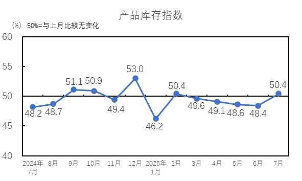 2025年7月,產(chǎn)品庫存指數(shù)為50.4%,高于臨界點(diǎn),較6月上升2.0個百分點(diǎn),紡織廠產(chǎn)品的庫存量下降。紗庫存量指數(shù)為50.7%,較6月上升2.4個百分點(diǎn);布庫存量指數(shù)為50.0%,較6月上升1.5個百分點(diǎn)。紗庫存量指數(shù)高于臨界點(diǎn),布庫存量指數(shù)處臨界點(diǎn)。