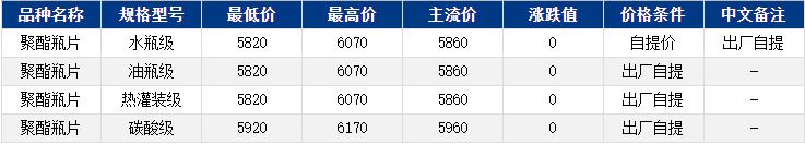 華東聚酯瓶片收于5860元/噸,漲跌值0元/噸,成本震蕩偏弱,工廠報(bào)盤走跌,然而交投冷淡,重心偏弱持穩(wěn)。8-10月貨源報(bào)盤5850-6060元/噸,遞盤在5820-5850元/噸,較高5890-5950元/噸。