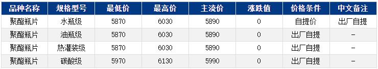 華東聚酯瓶片收于5890元/噸,漲跌值0元/噸,聚酯原料支撐偏弱,然而需求欠佳,聚酯瓶片多觀望,工廠報價多穩(wěn),震蕩偏弱運行。8-10月貨源報盤5870-6030元/噸,遞盤5870-5890元/噸,較高5940-5950元/噸。