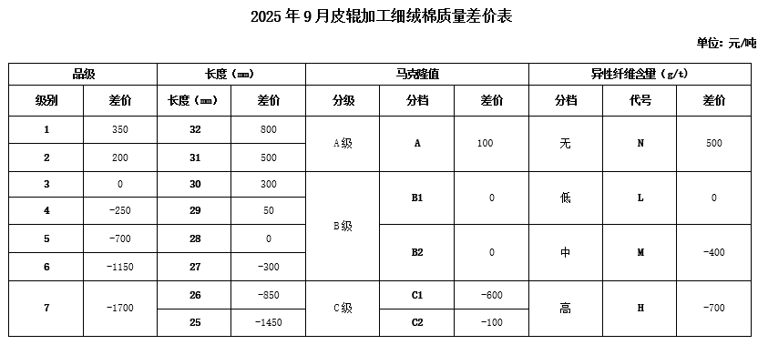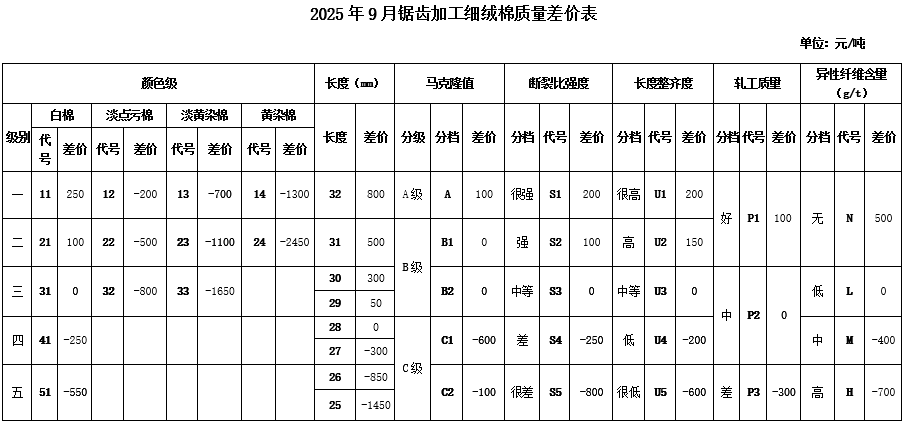 根據(jù)《中國棉花協(xié)會(huì)國產(chǎn)棉質(zhì)量差價(jià)表管理辦法》規(guī)定,現(xiàn)正式發(fā)布2025年9月《鋸齒加工細(xì)絨棉質(zhì)量差價(jià)表》、《皮輥加工細(xì)絨棉質(zhì)量差價(jià)表》、《長絨棉質(zhì)量差價(jià)表》(單位:元/噸)。