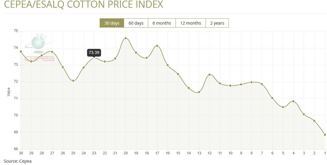 9月8日(周一),巴西CEPEA/ESALQ棉花價格指數(shù)報68.86美分/磅,較前一交易日下跌1.19%,較上月同期下跌4.17%。