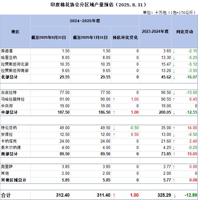 據(jù)內(nèi)陸協(xié)會和貿(mào)易來源提交的最新報告,CAI將2024/25年度軋棉量預估調(diào)整為3124萬包,調(diào)整幅度為10萬包。截至8月,約有3070.9萬包已運抵,預計9月將有53.1萬包。馬哈拉施特拉邦軋棉量預估上調(diào)10萬包至910萬包,安得拉邦上調(diào)5萬包至125萬包。然而特倫甘納邦軋棉量預估被下修5萬包至490萬包。