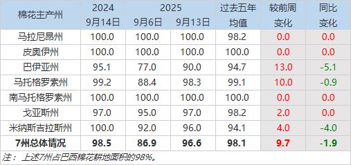 據(jù)巴西農(nóng)業(yè)部下屬的國(guó)家商品供應(yīng)公司CONAB,截至9月13日,巴西棉花收割率為96.6%,前周為86.9%,上年同期為98.5%,五年均值為98.1%。