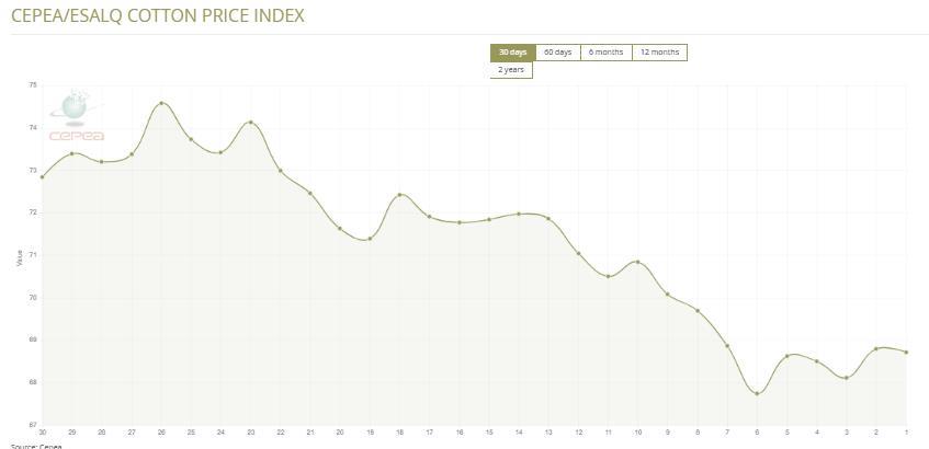 9月16日(周一),巴西CEPEA/ESALQ棉花價格指數(shù)報68.71美分/磅,較前一交易日下跌0.12%,較上月同期下跌4.38%。