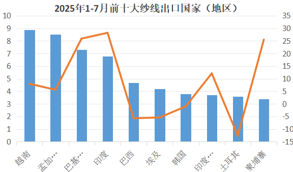 1-7月對(duì)巴基斯坦出口紗線7.3億美元,同比增長(zhǎng)25.8%。
