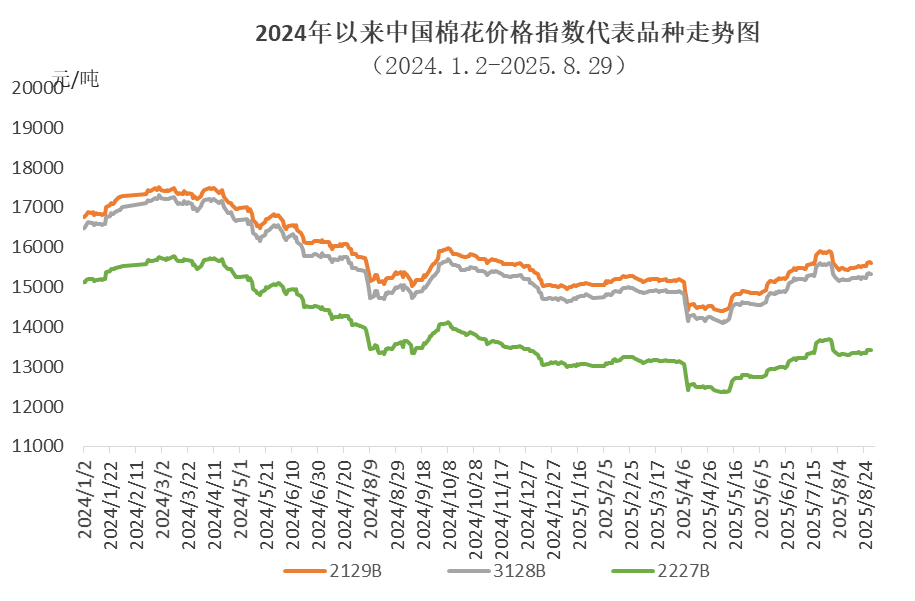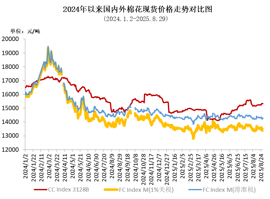 8月,國(guó)內(nèi)棉價(jià)呈先降后升走勢(shì)。月初因新棉增產(chǎn),市場(chǎng)供大于需求,棉價(jià)快速回落;隨后在國(guó)民經(jīng)濟(jì)運(yùn)行總體平穩(wěn)、中美斯德哥爾摩經(jīng)貿(mào)會(huì)談等利好消息帶動(dòng)下震蕩回升,月底增發(fā)20萬噸棉花進(jìn)口配額,對(duì)棉價(jià)影響較小。同期,國(guó)際棉價(jià)走勢(shì)偏震蕩回落,主要受美聯(lián)儲(chǔ)降息預(yù)期增強(qiáng)、美國(guó)對(duì)多國(guó)對(duì)等關(guān)稅正常政策生效、美棉簽約出口持續(xù)疲軟等因素影響。