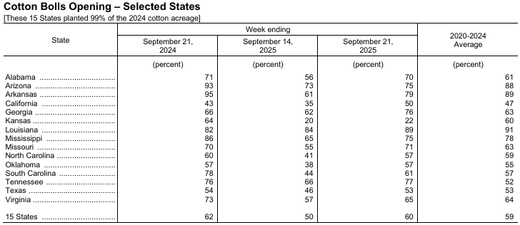 美國農(nóng)業(yè)部(USDA)在每周作物生長報告中公布稱,截至2025年9月21日當(dāng)周,美棉盛鈴率為60%,前周為50%,上年同期為62%,五年均值為59%。美棉收割率為12%,前周為9%,去年同期為13%,五年均值為12%。美棉優(yōu)良率為47%,前周為52%,上年同期為37%。