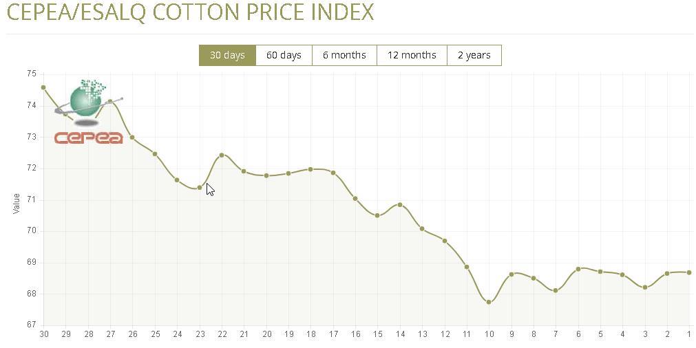9月22日(周一),巴西CEPEA/ESALQ棉花價(jià)格指數(shù)報(bào)68.68美分/磅,較前一交易日上漲0.04%,較上月同期下跌4.43%。