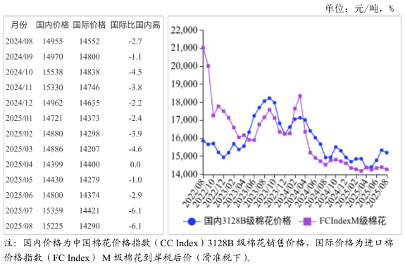 (一)國內(nèi)棉價環(huán)比小幅下跌。新疆棉陸續(xù)吐絮且天氣良好,新年度增產(chǎn)預(yù)期增強(qiáng),棉價小幅回落。8月,國內(nèi)3128B級棉花月均價每噸15225元,環(huán)比跌0.9%,同比漲1.8%。鄭棉期貨主力合約(2601)月結(jié)算價每噸14095元,環(huán)比跌0.7%,同比漲2.4%。
