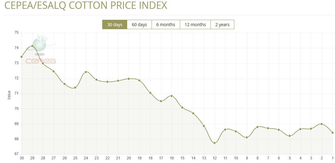 9月24日(周三),巴西CEPEA/ESALQ棉花價(jià)格指數(shù)報(bào)68.42美分/磅,較前一交易日下跌0.83%,較上月同期下跌4.79%。