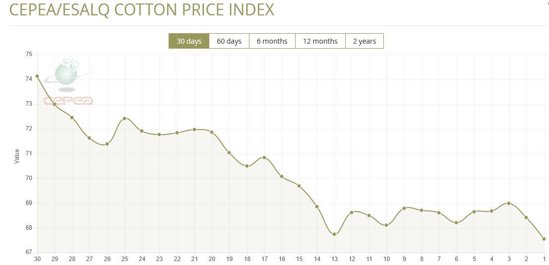 9月25日(周四),巴西CEPEA/ESALQ棉花價(jià)格指數(shù)報(bào)67.55美分/磅,較前一交易日下跌1.27%,較上月同期下跌6.00%。
