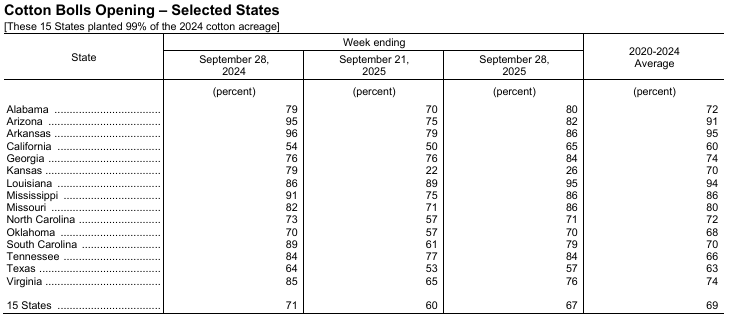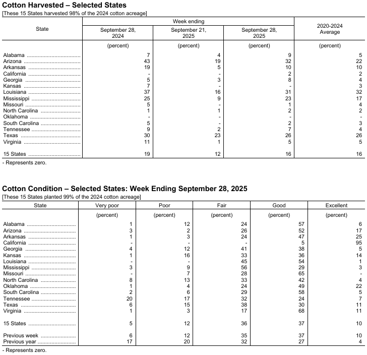 美國(guó)農(nóng)業(yè)部(USDA)在每周作物生長(zhǎng)報(bào)告中公布稱(chēng),截至2025年9月28日當(dāng)周,美棉盛鈴率為67%,前周為60%,上年同期為71%,五年均值為69%。美棉收割率為16%,前周為12%,去年同期為19%,五年均值為16%。美棉優(yōu)良率為47%,前周為47%,上年同期為31%。