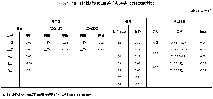 2025/26年度新棉開(kāi)始采收,依據(jù)中國(guó)棉花協(xié)會(huì)發(fā)布的2025年10月《鋸齒加工細(xì)絨棉質(zhì)量差價(jià)表》和2025年9月新疆籽棉平均公定衣分率,折算得出籽棉收購(gòu)差價(jià),與上月相比,做如下調(diào)整: