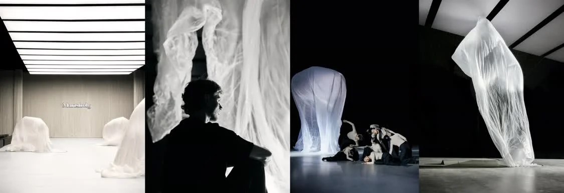 隨著音樂的起伏,舞者的步伐引領觀眾的目光在空間中游走。燈光漸次亮起,極簡而純粹的秀場緩緩顯現(xiàn),場內(nèi)三組動態(tài)裝置在氣流的推動下不斷鼓起、充盈、旋轉,像柔軟的白色氣息,懸浮于空氣中,既似輕盈的薄紗,又帶著雕塑般的體量感,在不斷的漲落間,賦予場域一種生機與張力。開場舞蹈《I am Fluid》由D.LAB.Dance團隊演繹,西班牙編舞家Iratxe Ansa與Igor Bacovich聯(lián)合創(chuàng)作,為秀場注入強烈的敘事性。舞者們的身體在裝置的搭配下,像是與空氣同頻,呈出女性力量的復雜性與多維度——柔弱、破碎、掙扎,又在流動中重生。空氣的涌動、光影的變幻、裝置的起伏、模特的律動,共同構建一個在“柔軟與力量”平衡的環(huán)境。