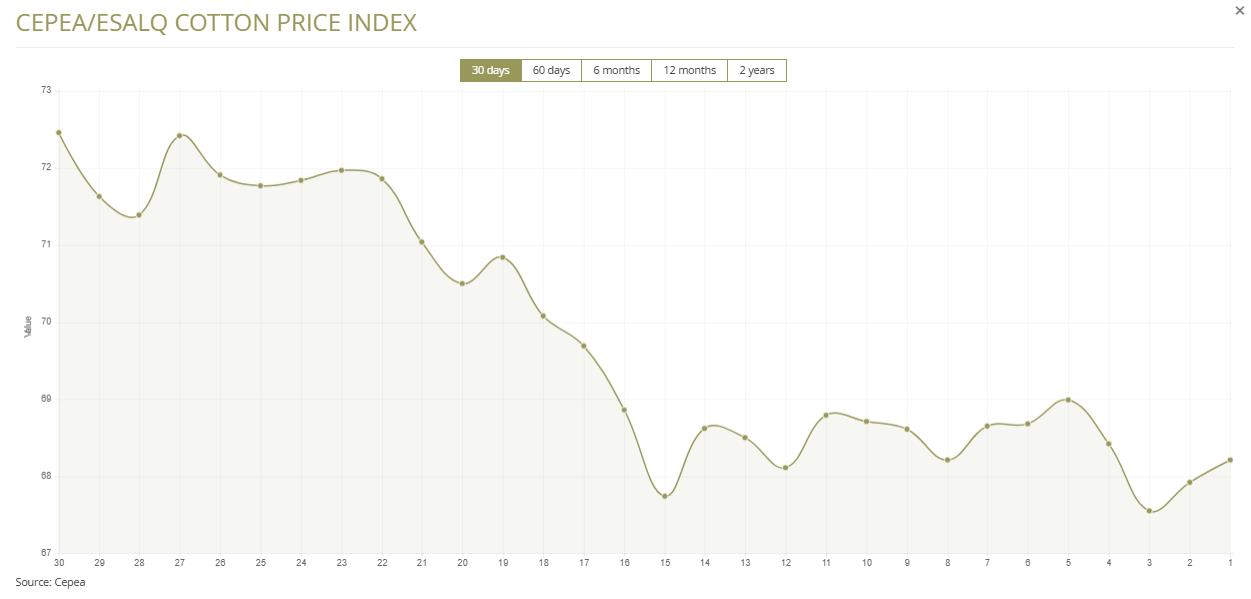 9月29日(周一),巴西CEPEA/ESALQ棉花價(jià)格指數(shù)報(bào)68.21美分/磅,較前一交易日上漲0.43%,較上月同期下跌5.08%。