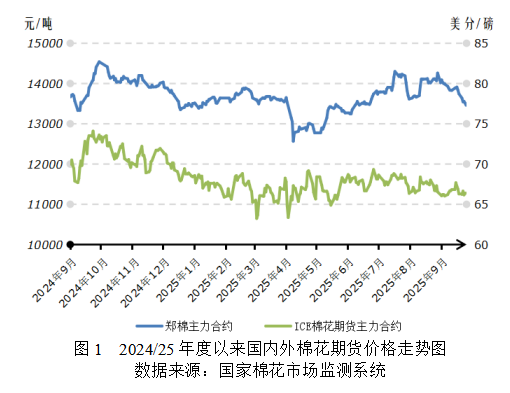 國內(nèi)市場方面,近1個(gè)月以來,受新棉增產(chǎn)預(yù)期強(qiáng)化、紡織傳統(tǒng)旺季成色不足、8月紡織外貿(mào)數(shù)據(jù)繼續(xù)下降等因素共同影響,國內(nèi)棉價(jià)連續(xù)下跌,鄭棉跌幅明顯,達(dá)到2025年5月以來最低水平。截至9月29日,鄭州商品交易所棉花期貨主力合約結(jié)算價(jià)13365元/噸,較上月末下跌895元/噸,跌幅6.28%;代表內(nèi)地標(biāo)準(zhǔn)級皮棉市場價(jià)格的國家棉花價(jià)格B指數(shù)14921元/噸,較上月下跌418元/噸,跌幅2.73%。內(nèi)外價(jià)差由上月末的2345元/噸收窄至2109元/噸。