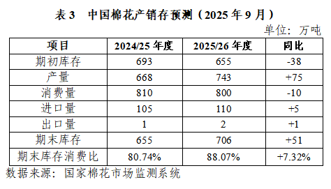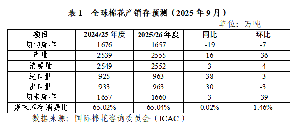 據(jù)國際棉花咨詢委員會(以下簡稱ICAC)9月發(fā)布的2025/26年度全球棉花產(chǎn)銷存預(yù)測數(shù)據(jù),產(chǎn)量為2555萬噸,同比增加16萬噸,環(huán)比減少36萬噸;消費(fèi)量為2552萬噸,同比增加3萬噸,環(huán)比減少4萬噸。總體上看,2025/26年度全球棉花產(chǎn)需基本平衡。