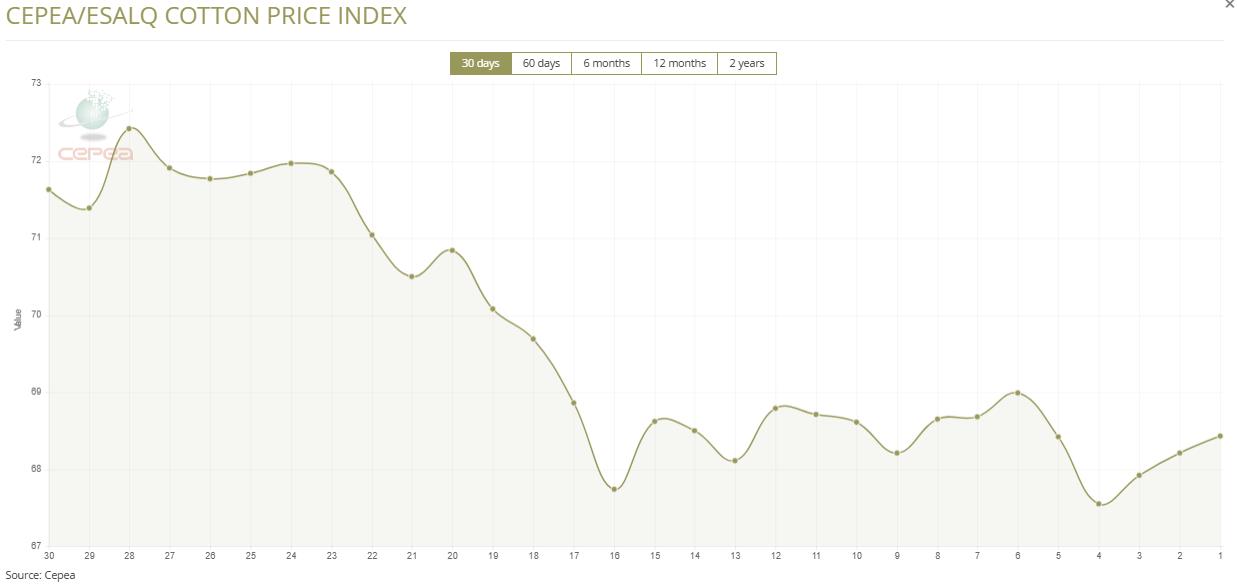 9月30日(周二),巴西CEPEA/ESALQ棉花價(jià)格指數(shù)報(bào)68.43美分/磅,較前一交易日上漲0.32%,較上月同期下跌4.77%。