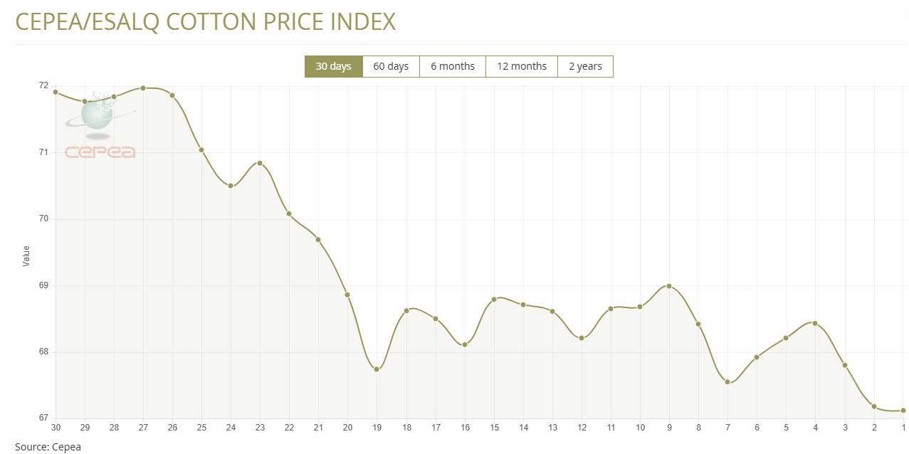 10月3日(周五),巴西CEPEA/ESALQ棉花價(jià)格指數(shù)報(bào)67.12美分/磅,較前一交易日下跌0.09%,較上月同期下跌1.91%。
