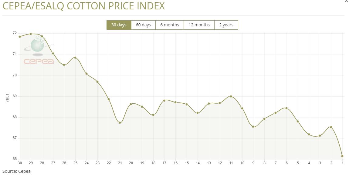 10月7日(周二),巴西CEPEA/ESALQ棉花價(jià)格指數(shù)報(bào)66.14美分/磅,較前一交易日下跌2.04%,較上月同期下跌3.35%。