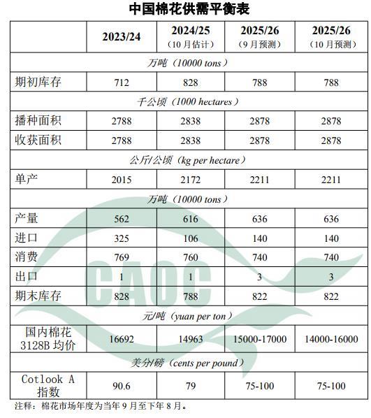 2024/25棉花市場年度結(jié)束。據(jù)海關(guān)統(tǒng)計,本年度中國實際進口量106萬噸,較估值調(diào)增1萬噸。本月對新年度棉花產(chǎn)量、消費量、進口量維持上月預(yù)測不變。棉花生長期間氣象條件適宜,局地單產(chǎn)和品質(zhì)高于預(yù)期,后期綜合分析后對產(chǎn)量進行調(diào)整。棉花進入集中采收期,據(jù)中國棉花信息網(wǎng)數(shù)據(jù),截至10月6日,新疆棉花采摘進度為24.9%,同比提高0.9個百分點。籽棉開秤價同比持平略跌,集中上市后存在下行風(fēng)險,2025/26年度國內(nèi)棉花價格區(qū)間調(diào)整為每噸14000-16000元。