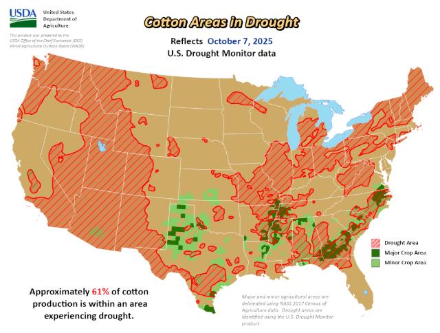 美國農(nóng)業(yè)部(USDA)下屬的首席經(jīng)濟(jì)學(xué)家辦公室(OCE)當(dāng)?shù)貢r間周四根據(jù)當(dāng)日發(fā)布的美國旱情監(jiān)測圖整理的美國農(nóng)業(yè)旱情文件顯示,截至10月7日當(dāng)周,大約61%美棉產(chǎn)區(qū)受到干旱影響,高于之前一周的59%。