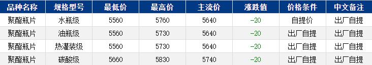 華東聚酯瓶片收于5640元/噸,漲跌值-20元/噸,商品悲觀情緒濃厚,原油拖累原料繼續(xù)下行,聚酯瓶片工廠報(bào)價(jià)多下調(diào)40-50元/噸,市場(chǎng)重心隨之下行。10-11月貨源報(bào)盤5560-5730或期貨合約2511平水至升水120,局部略低5540-5550,略高5780-5800;聽聞零星成交5560-5700。