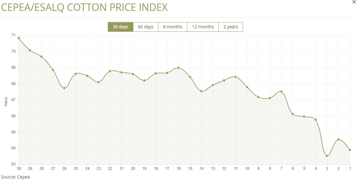 10月14日(周二),巴西CEPEA/ESALQ棉花價(jià)格指數(shù)報(bào)63.90美分/磅,較前一交易日下跌1.01%,較上月同期下跌6.62%。