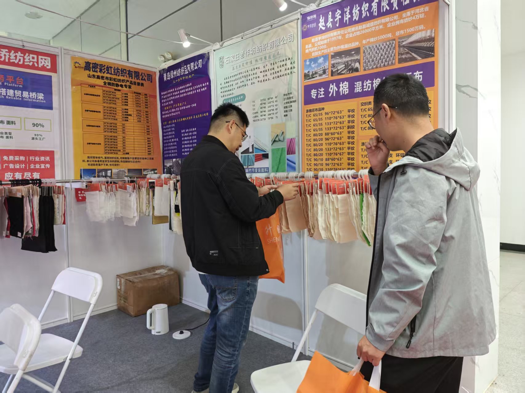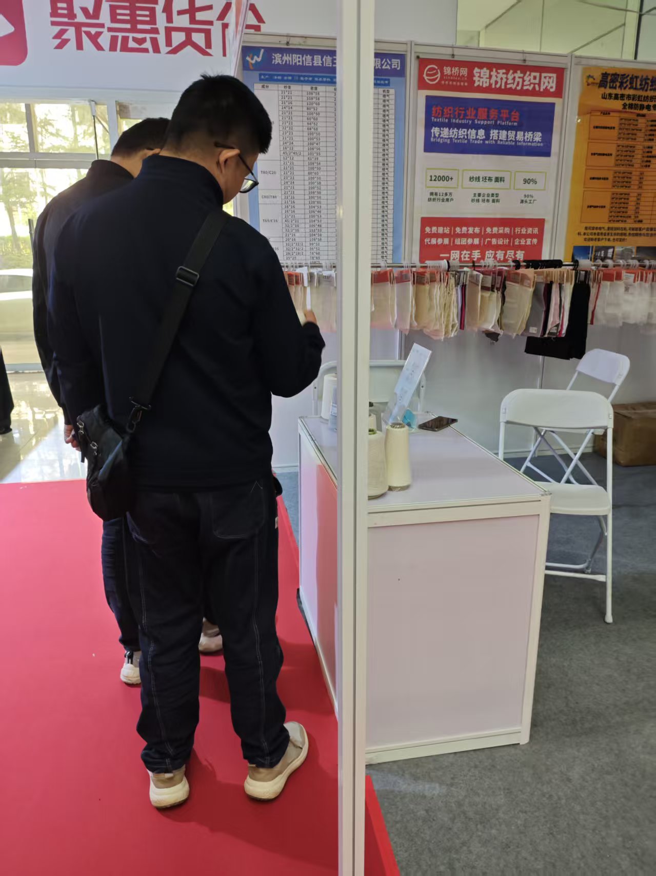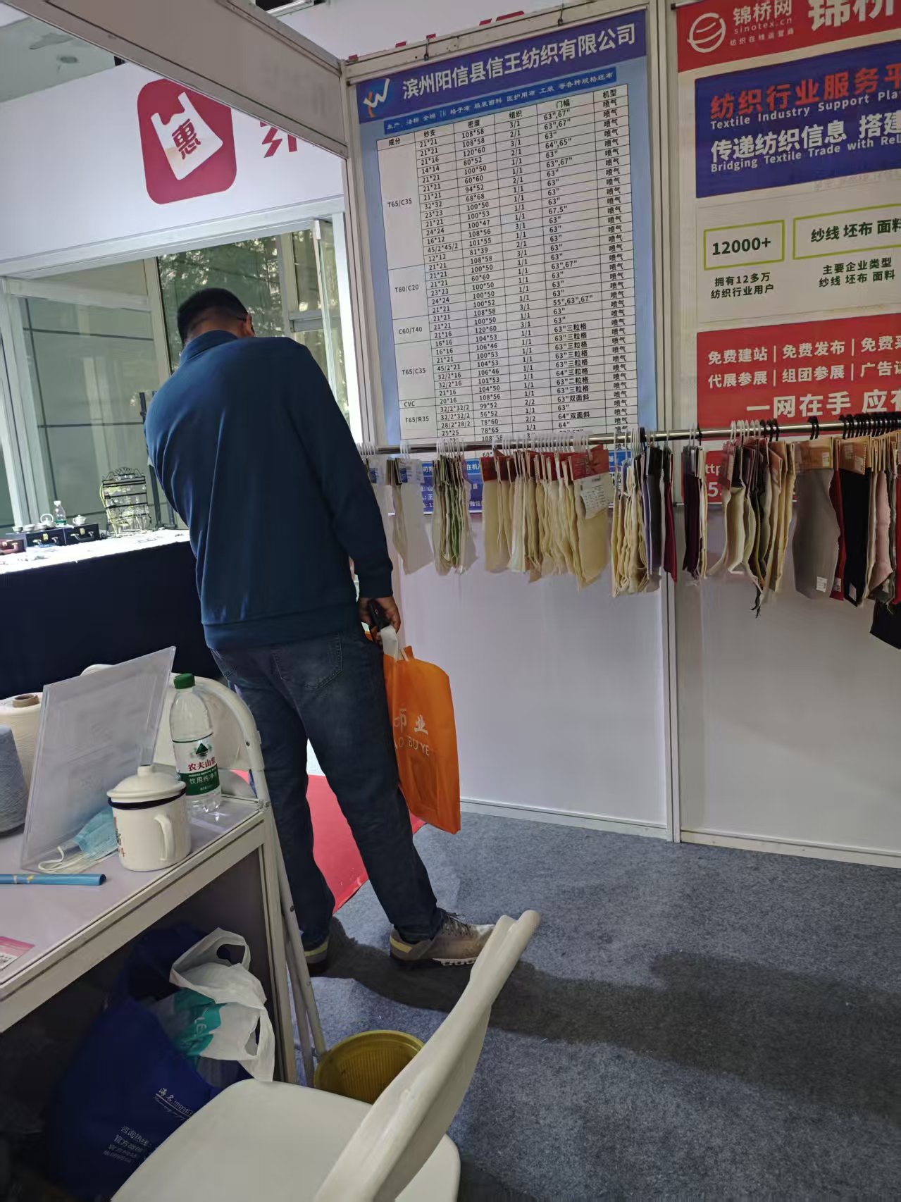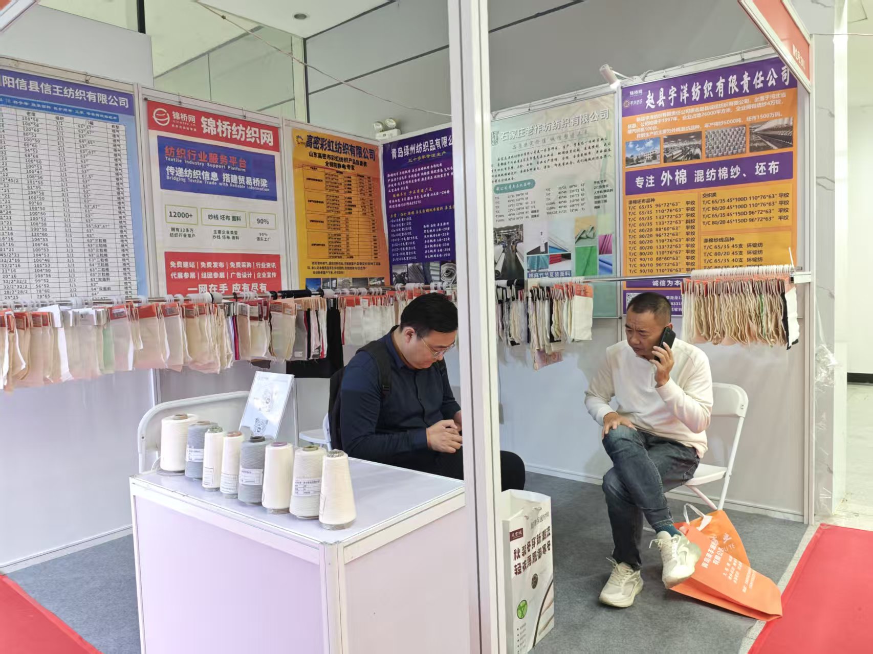 展會(huì)第一天到展位采購(gòu)商主要為盛澤客戶,采購(gòu)T50/C50 3米/3.2米/3.4米床品、工裝面料成品及滌棉紗、滌綸/尼龍織帶用紗為主。