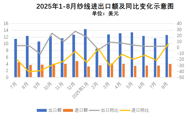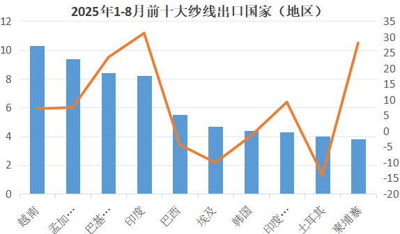 1-8月對印度出口紗線8.2億美元,同比增長31.2%。
