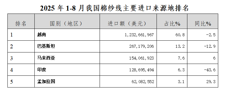 從進口來源看,進口棉紗前5大來源地全部來自亞洲地區(qū),前五大來源地合計占比90%。2025年1-8月自越南進口棉紗線54.9萬噸,同比增長8.4%,占棉紗線進口總量60%,進口金額達12.3億,同比降2.5%,占進口總額的60.6%。我國自馬來西亞、孟加拉進口棉紗線增長6%、29.3%,自巴基斯坦、印度進口棉紗線下降12.9%、43.6%。