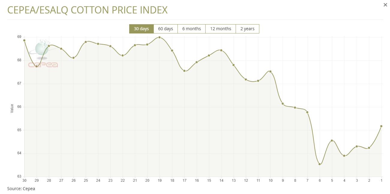 巴西CEPEA/ESALQ棉花價格指數(shù)報65.17美分/磅,較前一交易日上漲1.45%,較上月同期下跌4.76%。