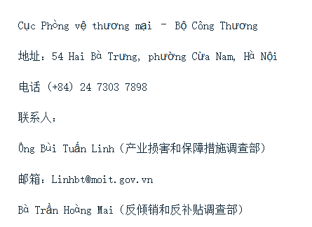 調(diào)查機(jī)關(guān)(越南工貿(mào)部貿(mào)易防衛(wèi)局)聯(lián)系方式: