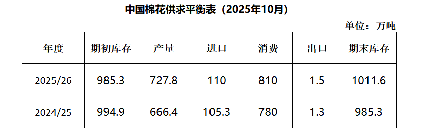 中國(guó)棉花協(xié)會(huì)預(yù)測(cè):2025/26年度全國(guó)棉花產(chǎn)量727.8萬噸,較上期上調(diào)6.2萬噸,同比增長(zhǎng)9.2%;棉花進(jìn)口量110萬噸,同比增長(zhǎng)4.5%;消費(fèi)量810萬噸,同比增長(zhǎng)3.8%,期末庫存相應(yīng)升至1011.6萬噸,同比增長(zhǎng)2.7%。