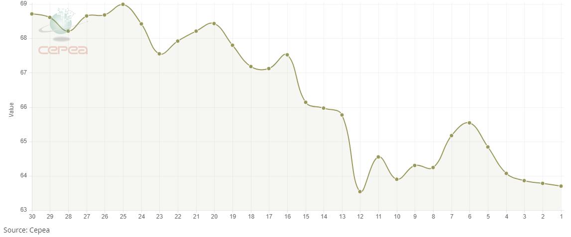 10月27日(周一),巴西CEPEA/ESALQ棉花價格指數(shù)報63.70美分/磅,較前一交易日下跌0.13%,較上月同期下跌6.91%。