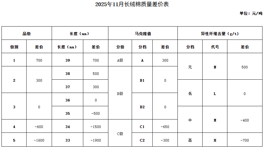 依據(jù)2025年10月的棉花公檢質(zhì)量數(shù)據(jù)、中國棉花協(xié)會(huì)質(zhì)量差價(jià)系統(tǒng)采集的加工企業(yè)銷售價(jià)和紡織廠到廠價(jià),及當(dāng)月的中國棉花價(jià)格指數(shù),并征求業(yè)內(nèi)相關(guān)專家的意見,與上月相比做出如下調(diào)整: