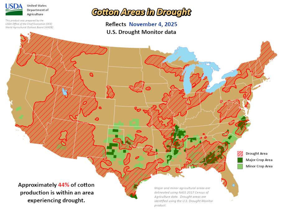 美國農(nóng)業(yè)部(USDA)下屬的首席經(jīng)濟學家辦公室(OCE)當?shù)貢r間周四根據(jù)當日發(fā)布的美國旱情監(jiān)測圖整理的美國農(nóng)業(yè)旱情文件顯示,截至11月4日當周,大約44%美棉產(chǎn)區(qū)受到干旱影響,前一周為50%。