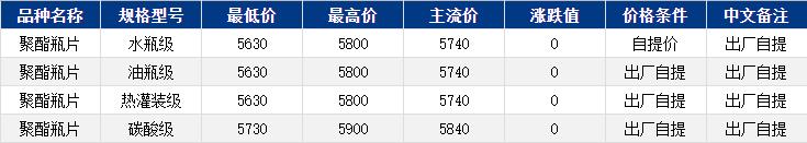 華東聚酯瓶片收于5740元/噸,漲跌值0元/噸,原料區(qū)間震蕩,聚酯瓶片工廠報(bào)價(jià)多穩(wěn),市場(chǎng)重心僵持整理,11-12月貨源報(bào)盤5670-5800,局部略低5620;遞盤5690-5750。