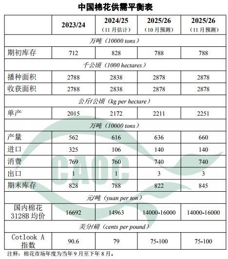 2025/26年度棉花采收基本結(jié)束,生長(zhǎng)期氣象條件良好,單產(chǎn)明顯提升,本月將棉花單產(chǎn)由每公頃2211公斤上調(diào)至2251公斤,增幅1.8%,產(chǎn)量調(diào)增至660萬(wàn)噸。新棉采收進(jìn)度快于上年,購(gòu)銷(xiāo)總體順利。據(jù)中國(guó)棉花網(wǎng)數(shù)據(jù),截至11月6日,全國(guó)棉花采摘進(jìn)度95.3%,同比提高1.3個(gè)百分點(diǎn),銷(xiāo)售率18.3%,同比提高12.2個(gè)百分點(diǎn)。