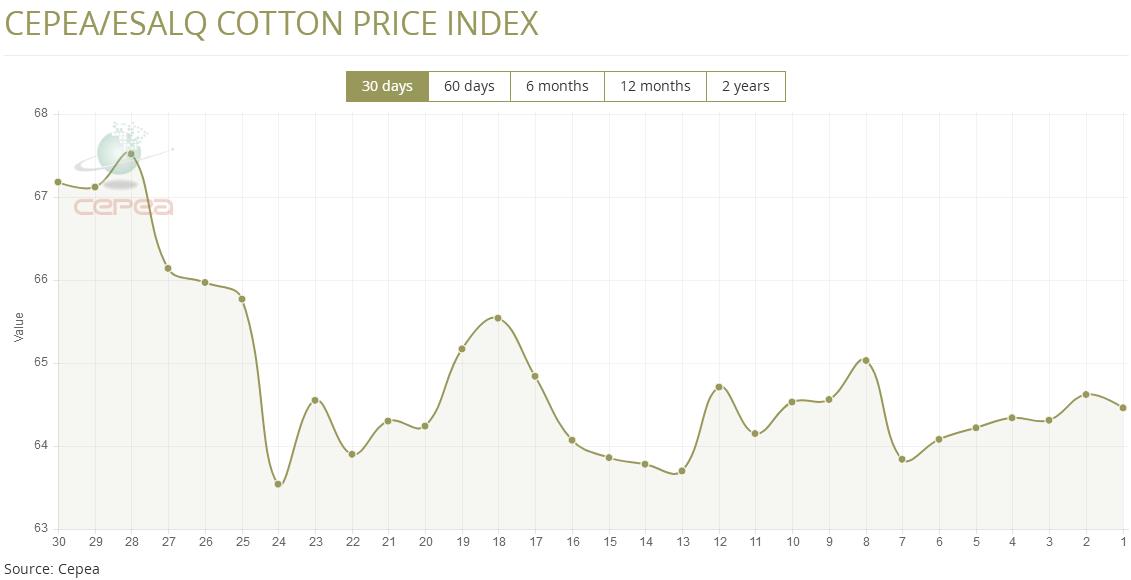 11月12日(周三),巴西CEPEA/ESALQ棉花價(jià)格指數(shù)報(bào)64.46美分/磅,較前一交易日下跌0.25%,較上月同期下跌0.09%。