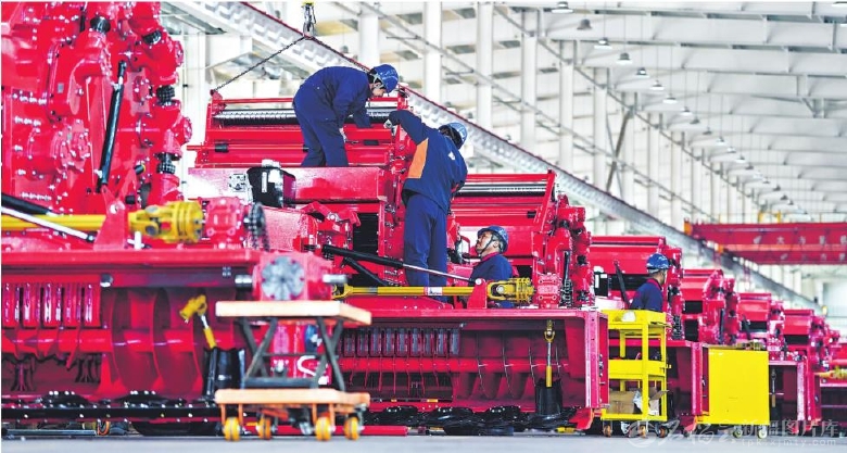 11月12日,工人在位于烏蘇市的新疆缽施然智能農(nóng)機(jī)股份有限公司生產(chǎn)車間組裝棉花秸稈收獲打包機(jī)。該公司是一家集研發(fā)、生產(chǎn)、銷售和服務(wù)為一體的現(xiàn)代化智能農(nóng)機(jī)制造企業(yè),產(chǎn)品熱銷國內(nèi)外市場。