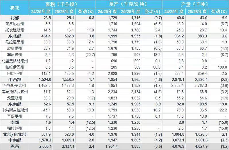2025/26年度巴西棉花單產(chǎn)預(yù)估為1885千克/公頃,同比減少3.6%,2024/25年度為1954千克/公頃。
