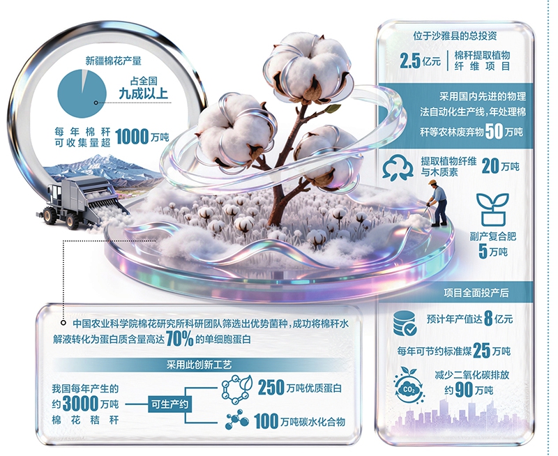 在沙雅縣山水環(huán)??萍加邢薰緩S區(qū)內(nèi),一座總投資2.5億元的棉稈提取植物纖維項目正穩(wěn)步推進。該項目采用國內(nèi)先進的物理法自動化生產(chǎn)線,年處理棉稈等農(nóng)林廢棄物50萬噸,提取植物纖維與木質(zhì)素20萬噸,副產(chǎn)復(fù)合肥5萬噸。