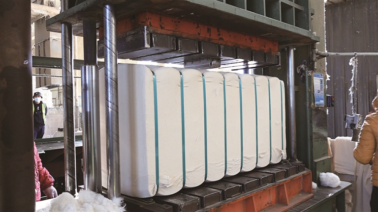 工人在軋花廠生產(chǎn)車間打包棉花。