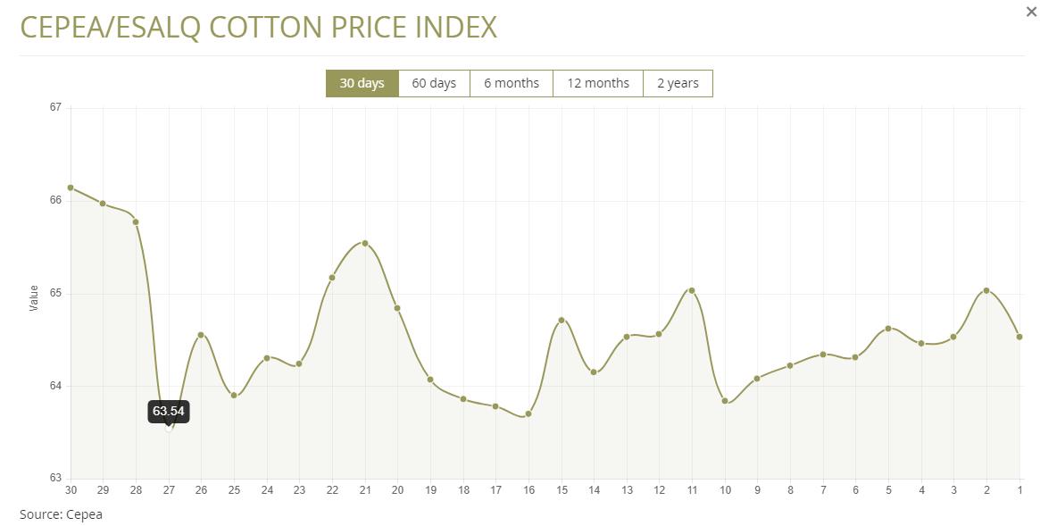 11月17日(周一),巴西CEPEA/ESALQ棉花價格指數(shù)報64.53美分/磅,較前一交易日下跌0.77%,較上月同期下跌0.05%。
