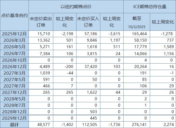 美國商品期貨交易委員會(CFTC)公布,截至10月3日,以ICE期棉2512合約點價未定價賣出訂單(UnfixedCallSales)較前周減少2198手至15710手。
