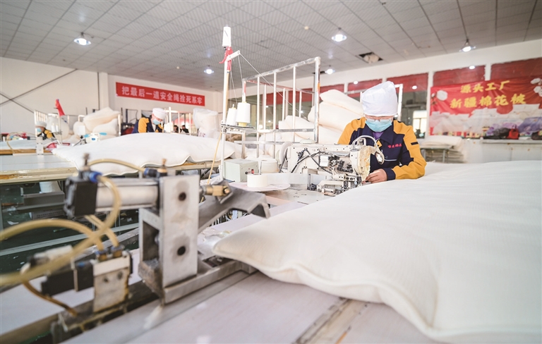 11月9日,在呼圖壁縣工業(yè)園區(qū)輕紡產(chǎn)業(yè)園的新疆唯美棉品家紡有限公司生產(chǎn)車間內(nèi),工人正在趕制棉被訂單。該公司日均生產(chǎn)棉被2500床,年產(chǎn)能突破90萬床。隨著氣溫下降,新疆棉被進(jìn)入銷售旺季,企業(yè)通過“線上+線下”雙渠道拓展市場(chǎng),訂單量持續(xù)攀升。