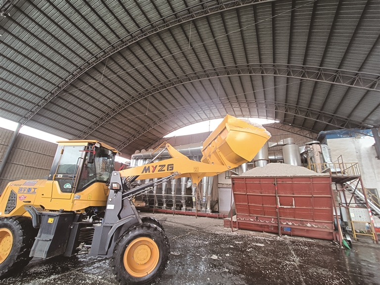 工作人員駕駛鏟車,將毛棉籽裝進(jìn)加工車斗。